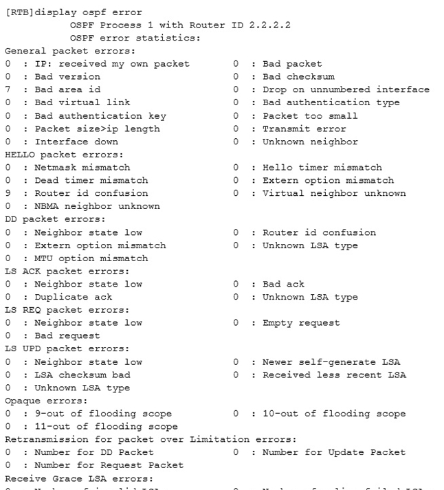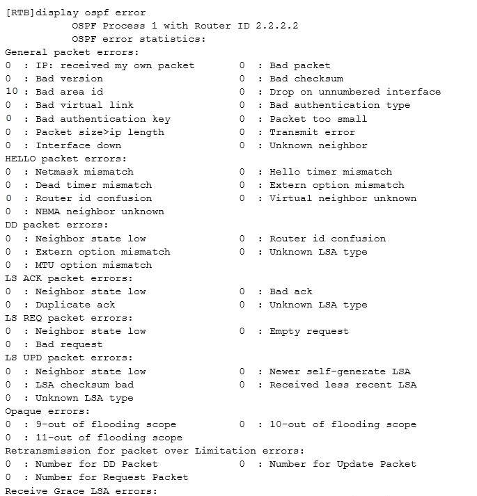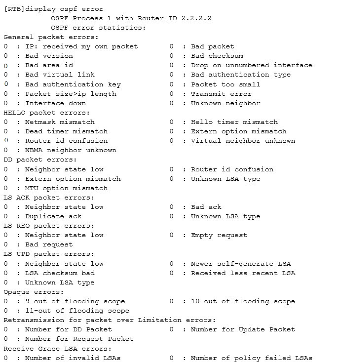 An OSPF neighbor relationship fails to be established and the display ospf error command output is as follows.