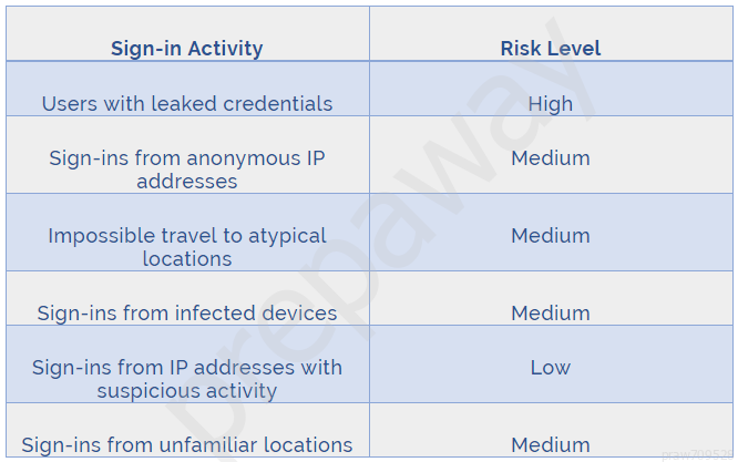 These six types of events are categorized in to 3 levels of risks - High, Medium & Low:      Reference: http://www.rebeladmin.com/2018/09/step-step-guide-configure-risk-based-azure-conditional-access-policies/