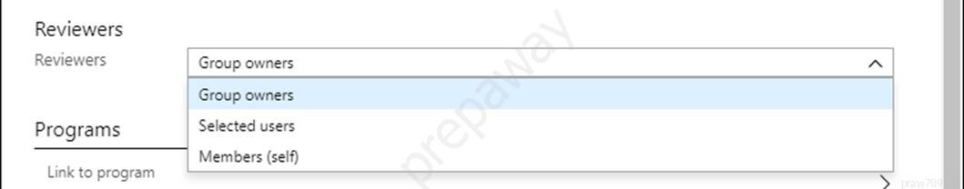 In the Reviewers section, select either one or more people to review all the users in scope. Or you can select to have the members review their own access. If the resource is a group, you can ask the group owners to review.       Reference: https://docs.microsoft.com/en-us/azure/active-directory/governance/create-access-review https://docs.microsoft.com/en-us/azure/active-directory/governance/manage-programs-controls