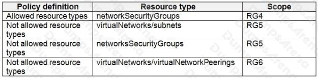 Box 1: RG4 onlyThe policy does not allow the creation of virtual networks in RG5 or RG6. Box 2: The policy does not allow the creation of NSGs in RG5.     References: https://docs.microsoft.com/en-us/azure/governance/policy/overview