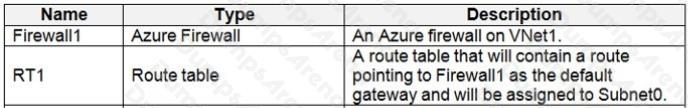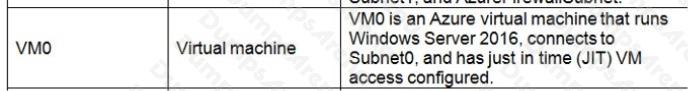 Azure Firewall has the following known issue:Conflict with Azure Security Center (ASC) Just-in-Time (JIT) feature. If a virtual machine is accessed using JIT, and is in a subnet with a user-defined route that points to Azure Firewall as a default gateway, ASC JIT doesn’t work. This is a result of asymmetric routing – a packet comes in via the virtual machine public IP (JIT opened the access), but the return path is via the firewall, which drops the packet because there is no established session on the firewall. Solution: To work around this issue, place the JIT virtual machines on a separate subnet that doesn’t have a user-defined route to the firewall. Scenario:     Following the implementation of the planned changes, the IT team must be able to connect to VM0 by using JIT VM access.     References: https://docs.microsoft.com/en-us/azure/firewall/overview