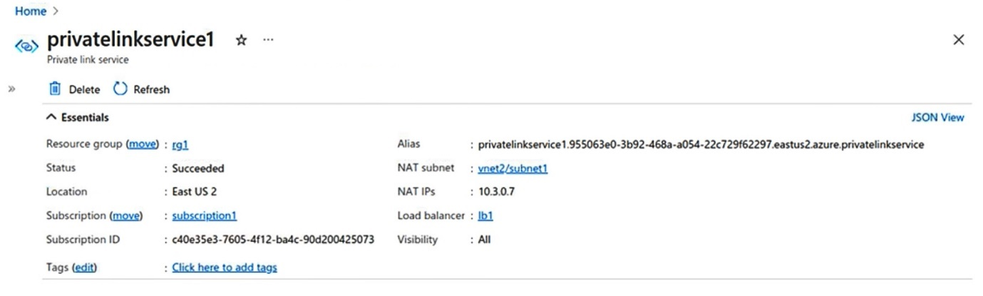You configure a private link service as shown in the privatelinkservice1 exhibit. (Click the privatelinkservice1 tab.)