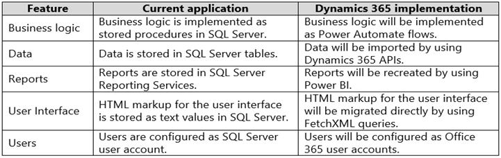 A company uses a legacy finance application that runs on a single SQL Server instance. The company plans to implement Dynamics 365 Finance. The following table describes the current implementation and design decisions for the new implementation: